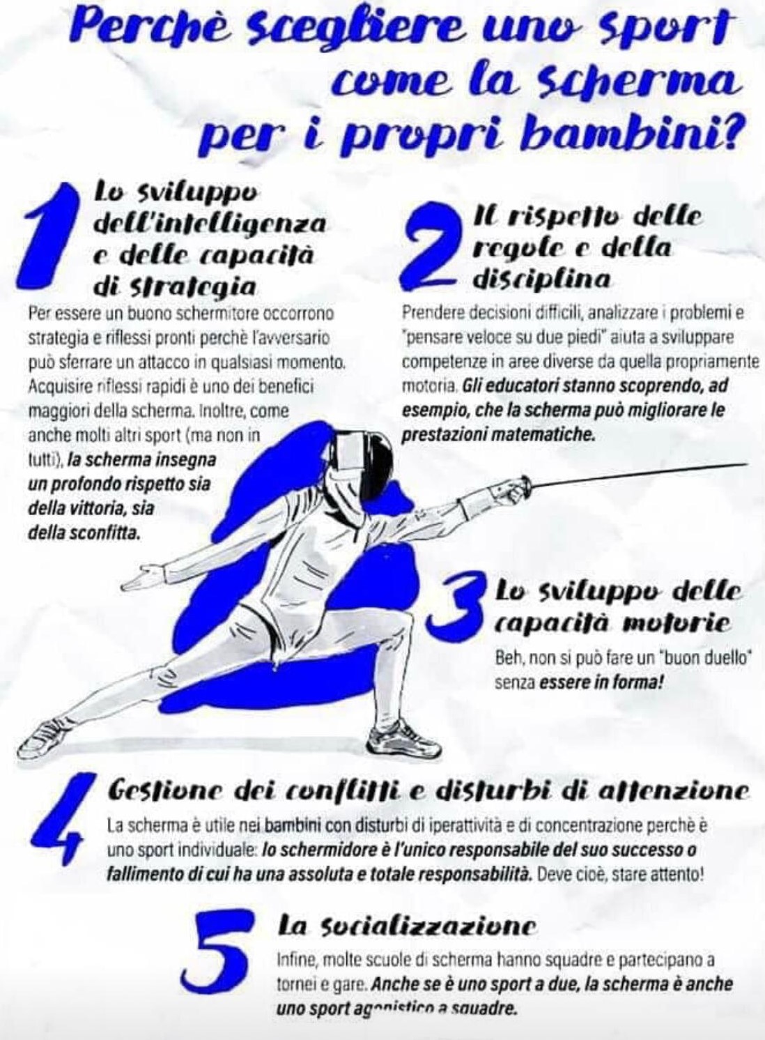 Praticare la scherma attribuisce preparazione mentale, conoscenza di se stessi, resilienza, estensione dei limiti personali, gestione della tensione.